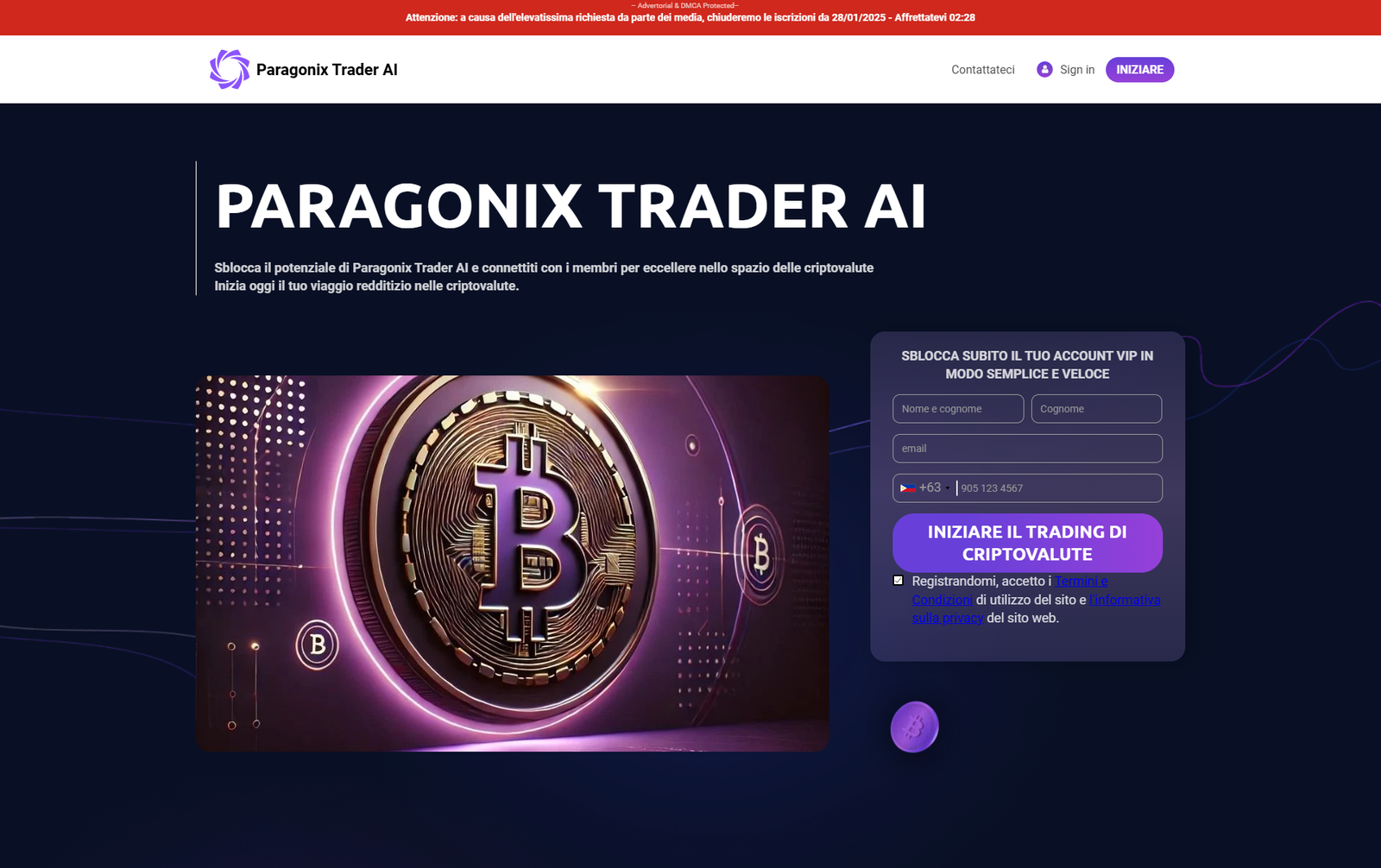 "ATTENZIONE!" Anche se non hai ancora deciso se vuoi unirti al progetto Paragonix Trader AI, ti invitiamo a inviare i tuoi dati e assicurarti un posto: ne abbiamo solo 12 disponibili! Potrai fare un micro-investimento di 250 euro e ottenere un ritorno economico sicuro. Una volta occupati tutti i posti, non potrai più investire nel progetto, quindi affrettati e iscriviti a Paragonix Trader AI.